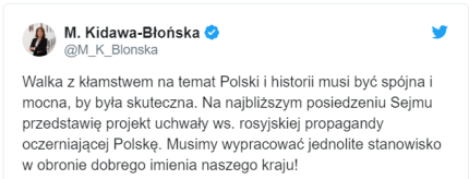 "Боротьба з брехнею про Польщу і історію повинна бути послідовною і сильною, щоб бути ефективною. На наступному засіданні сейму я представлю проєкт резолюції про російську пропаганду, якою обмовляють Польщу. Ми повинні виробити єдину позицію в захисті доброго імені нашої країни!", - написала Кідава-Блонська в Twitter, зазначивши, що новий законопроєкт буде представлений парламентаріям вже 8 січня.