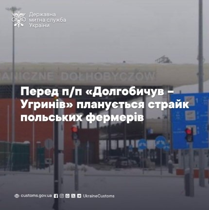 Державна митна служба України попереджає, що 23 січня 2026 року польські фермери планують страйкувати з 11:00 до 15:30 за польским часом перед пунктом пропуску “Долгобичув – Угринів”.