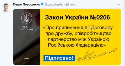 "Непродовження Договору про дружбу і співробітництво між Україною і Росією слід розглядати не як епізод, а як частину нашої стратегії на остаточний розрив з колоніальним минулим і переорієнтації на Європу", - підкреслив Порошенко, коментуючи підписання важливого закону.