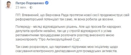 «Попереду - місяці відповідальних рішень. Але що просив би народних депутатів зробити негайно, так це в суворій відповідності з усіма регламентними процедурами почати розгляд внесеного мною законопроекту «Про Антикорупційний Суд», - пише Порошенко.