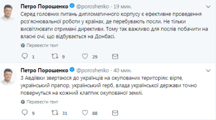 Також Порошенко додав, що в даний час на Донбасі знаходяться всі українські посли, які приїхали на лінію фронту, щоб на власні очі побачити, чого зараз потребує Донбас.