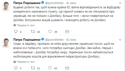 Під час урочистого запуску газопроводу, через який буде поставлятися газ в Авдіївку, Порошенко заявив, що Україна буде домагатися, щоб кожна країна Євросоюзу взяла на себе відповідальність за відновлення конкретного населеного пункту в Луганській і Донецькій областях, які зруйновані в результаті збройної агресії Росії проти України .