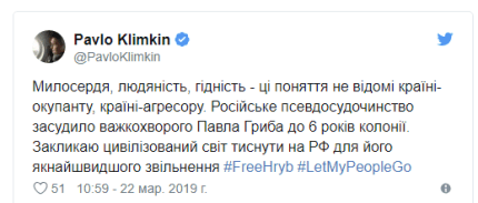 "Російське псевдосудочинство засудило важкохворого Павла Гриба до 6 років колонії", – написав він.