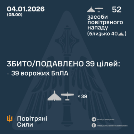 За попередніми даними, станом на 08:00, протиповітряною обороною збито/подавлено 39 ворожих БпЛА типу Shahed, Гербера і дрони інших типів на півночі та сході країни.