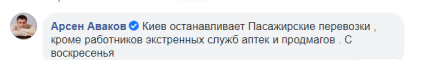 "Уряд, президентський штаб готує такі варіанти для вирішення. Моя позиція зробити це якомога раніше. Громадським транспортом, зараз повинні користуватися медики, військові, правоохоронці, аптекарі, рятувальники, продавці продуктових магазинів і співробітники комунальних служб і систем життєзабезпечення. Решта - не виходити з дому! Київ зупиняє пасажирські перевезення, крім працівників екстрених служб, аптек і продмагів з неділі ", - написав Аваков.