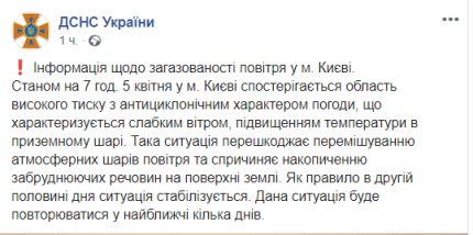"У Києві 5 квітня спостерігається область високого тиску з антициклонічним характером погоди, що характеризується слабким вітром, підвищенням температури в приземному шарі. Така ситуація перешкоджає перемішуванню атмосферних шарів повітря і викликає накопичення забруднюючих речовин на поверхні землі. Як правило в другій половині дня ситуація стабілізується. Дана ситуація буде повторюватися в найближчі кілька днів ", - попередили рятувальники.