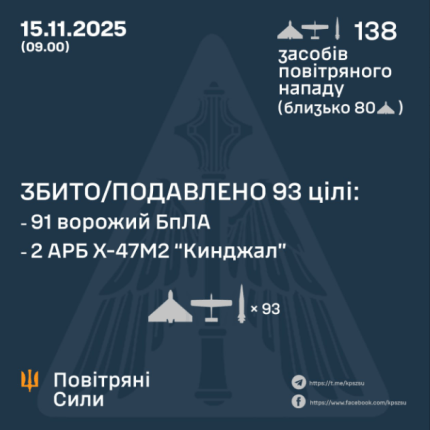 Протягом ночі 14-15 листопада російські загарбники здійснювали атаку трьома аеробалістичними ракетами Х-47М2 “Кинджал” із повітряного простору Тамбовської області, а також 135 ударними БпЛА типу Shahed, Гербера і безпілотниками інших типів.