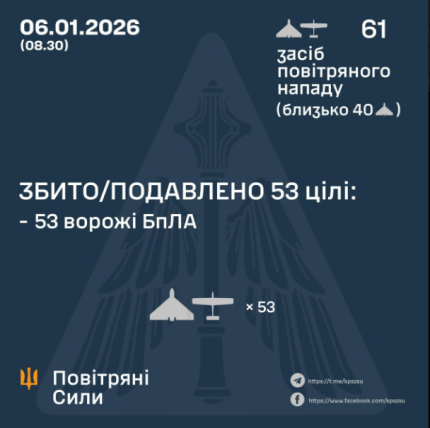За попередніми даними, станом на 08:30, протиповітряною обороною збито/подавлено 53 ворожі БпЛА типу Shahed, Гербера і дрони інших типів на півночі, центрі та сході країни.