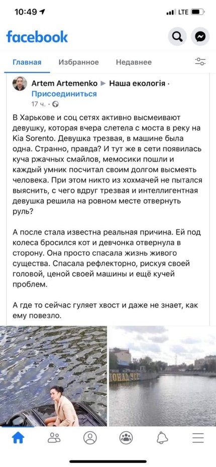 Декілька днів поспіль українці не втомлюються обговорювати резонансну ДТП, яка сталася в центрі Харкова — саме там, на Набережній, дівчина на автомобілі KIA знесла на великій швидкості огорожу та впала в річку. Після цього, рятуючи своє життя, вона вилізла на дах авто, що тонуло, де і дочекалась приїзду рятувальників та швидкої. Дівчину оперативно дістали з річки й надали першу допомогу. За словами поліцейських, вона не постраждала, лише трохи злякалася. Очевидці події зняли дівчину на даху авто, що тонуло, — за лічені години ці кадри заполонили українську мережу, ба більше, деякі з них навіть вже встигли перетворитися на меми. Проте лише нещодавно стало відомо, якою ж була реальна причина ДТП. Сама дівчина, яка виявилася працівницею ДСНС, розповіла, що злетіла в річку, оскільки хотіла врятувати життя кота, який неочікувано кинувся під колеса її автівки. Про це інформує ONLINE.UA з посиланням на місцеве видання "Суспільне Харків".