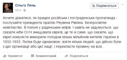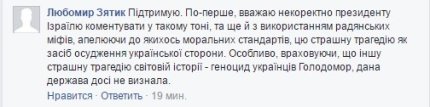 "Під час парламентських слухань, присвячених трагедії Бабиного Яру, де вбивали і українців, і євреїв, і ромів, і людей іншої крові - президент Ізраїлю Рівлін із трибуни українського парламенту заявив, що серед пособників нацистських злочинів було багато українців. На жаль, усі присутні в парламентському залі - і президент, і депутати, і міністри промовчали. Виступ Рівліна принижує українців, тому я закликаю президента Ізраїлю вибачитися перед нашою державою і нашим народом. А Кнесет Ізраїлю - нарешті визнати Голодомор геноцидом українського народу, як Верховна Рада ще в 2008 році визнала Голокост геноцидом євреїв", - написав лідер Радикальної партії Олег Ляшко на своїй сторінці в Facebook.