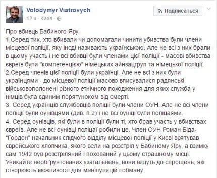 "Близько 1,5 млн євреїв були вбиті на території сучасної України під час Другої світової війни в Бабиному Яру і багатьох інших місцях. Їх розстрілювали в лісах, біля ярів і ровів, зіштовхували в братські могили. Багато посібників злочину були українцями. І серед них особливо виділялися бійці ОУН, які знущалися над євреями, вбивали їх і в багатьох випадках видавали німцям", - сказав Рівлін.