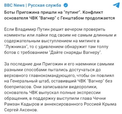 Якщо Володимир Путін вирішить ввечері перевірити коменти або лайки під своїм не найдовшим і не найзмістовнішим виступом на мітингу в "Лужниках", то з подивом виявить там натовп ботів з вимогою "Дайте снаряди Вагнеру, - зазначають журналісти.