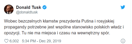 "Через безсоромну брехню президента Путіна і російську пропаганду необхідна спільна позиція польської влади і опозиції. Тут немає місця і часу на внутрішні суперечки", - відреагував на ситуацію Туск.