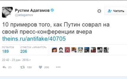 Видання The Insider опублікувало добірку з 10 брехливих висловлювань президента Росії Володимира Путіна, зроблених ним на підсумковій річній прес-конференції 22 грудня 2016 року.
