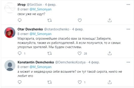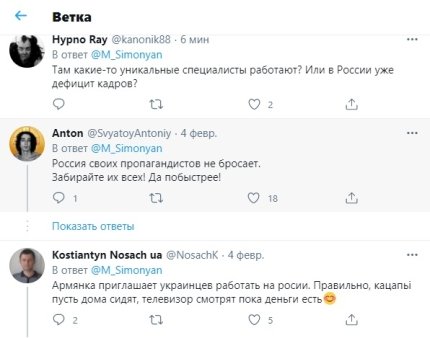 "Кому набридло працювати на своїх смітниках, приходьте на наші; Ніхто не піде на ваш смітник; Маргарита, скоро вам будуть пропонувати роботу. Що більше подобається: шити рукавиці або валянки? У колонії для вас робота точно знайдеться; Там якісь унікальні фахівці працюють? Або в Росії вже дефіцит кадрів?; Росія своїх пропагандистів не забуває; Забирайте їх усіх! Та швидше!; Вірменка запрошує українців працювати на РФ. Правильно, кацапьи нехай вдома сидять, телевізор дивляться, поки гроші є; Маргарита, величезне спасибі вам за допомогу! Заберіть, будь ласка, також їх роботодавців. А якщо вийде, то й самих упоротих глядачів. Ми будемо щасливі; а може і Медведчука собі візьмете? він тут такий сирота, ніхто не любить його", - коментують пропозицію путінської пропагандистки користувачі мережі.