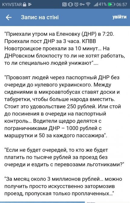 Відзначається, що КППВ бойовиків безкоштовно можна перетнути лише за 6-7 годин, а український всього за 15 хвилин. Обурені жителі "ЛДНР" вважають, що таким чином бойовики в черговий раз принижують їх, примушуючи платити за виїзд з окупованої території.