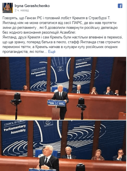 На своїй сторінці в соцмережі Геращенко прокоментувала скандал в ПАРЄ, який виник після обурливої заяви Ягланда з закликом повернути Росію, незважаючи на те, що ця країна не виконала жодного пункту резолюції ПАРЄ. Депутатка вважає, що новий курс економії коштів РЄ, яким Ягланд загрожує через фінансову кризу організації, що виник на тлі відмови Росії платити внески, потрібно почати з власного офісу і з власної зарплати.