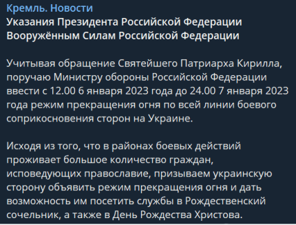 У Кремлі зазначили, що Путін нібито врахував звернення російського патріарха Кирила і доручив міністру оборони РФ Сергію Шойгу запровадити з 12.00 6 січня 2023 року до 24.00 7 січня 2023 року "режим припинення вогню по всій лінії бойового зіткнення в Україні".