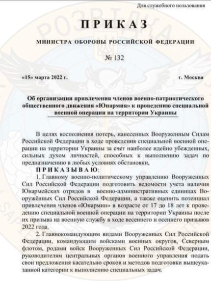 ГУР уже оприлюднила відповідний російський наказ "Про організацію залучення членів військово-патріотичного громадського руху "Юнармія" до проведення спеціальної операції на території України".