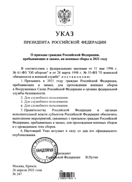 "Ухвалюю призвати в 2021 році громадян Російської Федерації, які перебувають в запасі, для проходження військових зборів у Збройних Силах Російської Федерації та органах федеральної служби безпеки", - йдеться в указі Путіна.