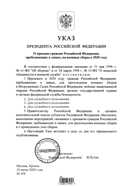 "Закликати в 2020 році громадян РФ, які перебувають в запасі, для проходження військових зборів у збройних силах РФ, військах національної гвардії РФ, органах державної охорони та органах Федеральної служби безпеки", - йдеться в указі Путіна.