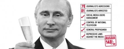 Серед звинувачень на адресу Путіна "Репортери без кордонів" назвали 70 випадків агресії проти журналістів в Росії, 81 арештованого журналіста, залякування користувачів соцмереж, контроль над національним телебаченням, пропаганду і репресивні закони проти медіа.
