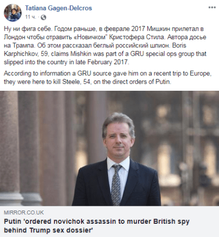 Карпичков стверджує, що Путін особисто наказував отруїти "Новачком" Стіла одному і тому ж виконавцю - "Олександру Петрову", справжнє ім'я якого Олександр Мішкін. За даними екс-агента КДБ, в лютому 2017 року Петров-Мішкін разом з групою спецагентів ГРУ приїхав до Великої Британії, щоб "прибрати" Крістофера Стіла за прямим наказом Путіна, але зробити задумане йому не вдалося.