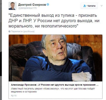 Журналіст кремлівського пулу Дмитро Смирнов викликав гнів у мережі публікацією російського письменника Олександра Проханова, який натякнув на визнання РФ так званих ДНР-ЛНР.