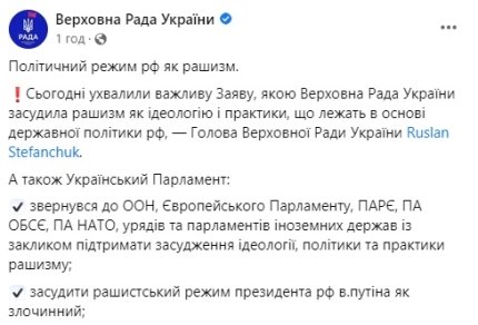 Верховна Рада публічно засудила ідеологічні засади та суспільні практики режиму російського диктатора Володимира Путіна, звернувши увагу на те, що вони є тоталітарними й людиноненависницькими. Окрім того, нардепи звернулися до міжнародної спільноти.