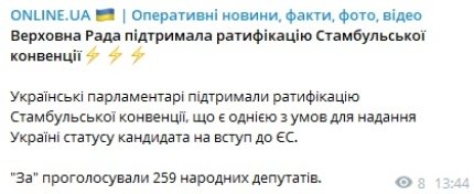 20 червня парламент України підтримав ратифікацію Конвенції Ради Європи про запобігання насильству стосовно жінок і домашньому насильству та боротьбу із цими явищами, більш відомої як Стамбульська конвенція.