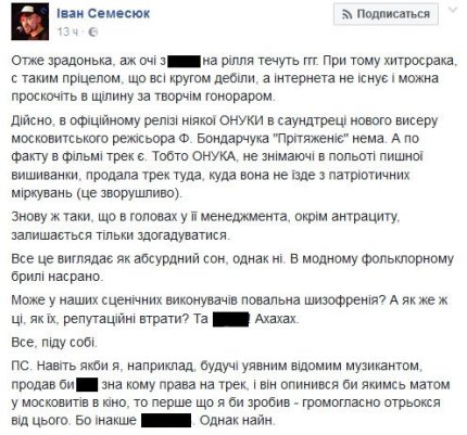 Письменник, музикант, ведучий програми "Еволюція або смерть" на Old Fashioned Radio Іван Семесюк звинуватив українську електро-фолк групу ONUKA у продажу пісні колективу російському режисерові Федору Бондарчуку для фільму "Тяжіння".