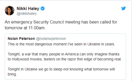 "Надзвичайне засідання Ради Безпеки було скликано на завтра на 11:00", - повідомила вона в Тwitter.