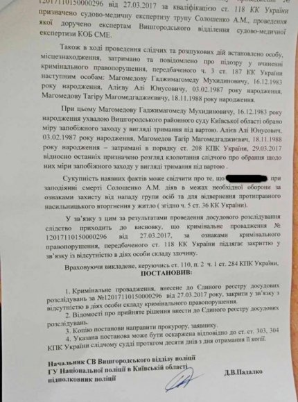 "Слідчим Національної поліції, за погодженням з прокуратурою, закрито кримінальне провадження за фактом вчинення умисного вбивства при можливому перевищенні меж необхідної оборони", - додав Геращенко.
