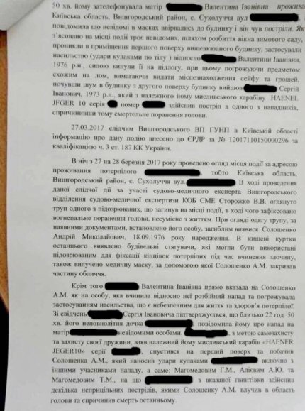 Як повідомляв ONLINE.UA, під Києвом в селі Сухолуччя чоловік застрелив одного з грабіжників, які увірвалися в його будинок і почали бити господиню, вимагаючи віддати цінності з сейфа. Убитим виявився 40-річний безробітний і неодноразово судимий житель Сумської області.