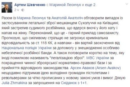 "Переконаний, що це - хороший приклад самозахисту. Прогнозую, що сміливому стрілку не загрожує кримінальна відповідальність за ст. 118 КК. Навпаки - він гідний заохочення від Національної поліції за допомогу в знешкодженні особливо небезпечної розбійної банди", - написав спікер МВС.