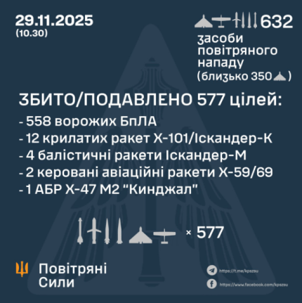 За попередніми даними, станом на 10.30, протиповітряною обороною збито/подавлено 577 повітряних цілей: