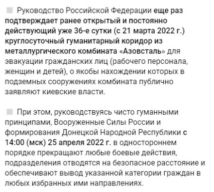 Керівництво Російської Федерації ще раз підтверджує раніше відкритий та постійно діючий вже 36-ту добу (з 21 березня 2022 р.) цілодобовий гуманітарний коридор з металургійного комбінату "Азовсталь" для евакуації цивільних осіб (робочого персоналу, жінок та дітей), про нібито перебування яких у підземних спорудах комбінату публічно заявляє київська влада. При цьому, керуючись суто гуманними принципами, Збройні Сили Росії та формування Донецької Народної Республіки з 14:00 (мск) 25 квітня 2022 р. в односторонньому порядку припиняють будь-які бойові дії, підрозділи відводяться на безпечну відстань та забезпечують виведення зазначеної категорії громадян за будь-якими обраними. ними напрямами, - йдеться в повідомленні російської влади.