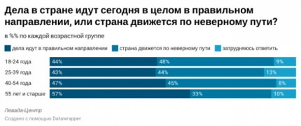 Окрім того, зазначається, що половина респондентів, які отримують новини з соцмереж (50%) або з інтернет-видань (47%), схиляються до негативної оцінки того, що відбувається. 57% тих, хто дізнається новини по телебаченню, впевнені у правильному шляху Росії.