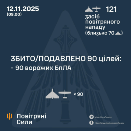 Як повідомляють Повітряні сили ЗСУ, протягом ночі 11-12 листопада російські загарбники здійснювали атаку на мирні українські міста та села 121 ударним БпЛА типу Shahed, Гербера і безпілотниками інших типів. ППО змогла знешкодити 90 ворожих цілей.
