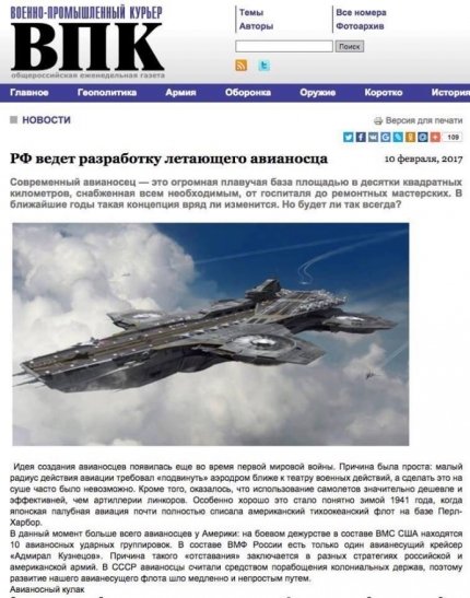 При тому темі розробки "літаючих авіаносців" присвячений лише один абзац: "Літаючі авіаносці сьогодні здаються чимось фантастичним. Але і в 1917 році уявити собі, що буде створений такий корабель, як "Адмірал Кузнєцов" (котрий насмішив весь світ своїм походом з Мурманська до Сирії - Ред.), могли тільки письменники-фантасти. Тому цілком ймовірно, що "правнуки" "Адмірала Кузнєцова" будуть борознити не моря, а повітряний океан".