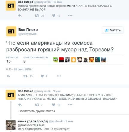 «Москва представила нову версію #MH17. А що як ніякого Боїнга не було?», - іронізує користувач «Все Плохо».