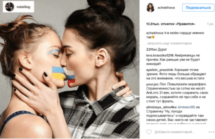 Анфіса опублікувала в своєму особистому мікроблозі фото поцілунку двох жінок з розфарбованими в кольори українського і російського прапорів губами.