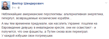 "Ненайближчі американські перспективи: альтернативна енергетика, гіперлуп, космічні кораблі, які повертаються... А ми тим часом придумали, як насолити Україні: пошлемо на Євробачення дівчину в інвалідному кріслі, вони її освистять - і вийде, що вони фашисти, а Путін знову всіх переграв", - написав він.
