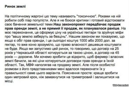 Так, сайти "Україна.ру" і українські "Вести" писали про скасування пенсій і про введення негайної приватизації земель сільськогосподарського призначення, а також про те, що в знятті мораторію на продаж землі нібито «безпосередньо зацікавлені представники європейських і американських компаній».