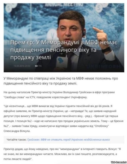 "Ви говорите про те, що МВФ вимагає від України підняти пенсійний вік до 65 років. Я офіційно заявляю як прем'єр-міністр країни, це - неправда... Це брехня... Це перша позиція... І позиція номер два... Ніде не написано про продаж українських земель... Тому це брехня номер два... а які ви меморандуми читаєте? Можливо, ви їх самі пишете, а потім поширюєте? І знову ж лякаєте людей», - підкреслив прем'єр-міністр.