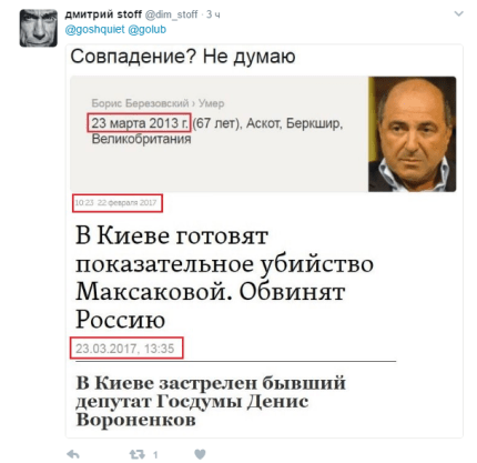 "Ух ти. Російський сайт анонсував вбивство Вороненкова рівно місяць тому. Від якогось "військового експерта "Жиліна", - написав він.