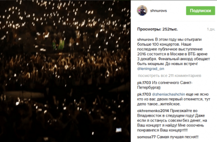 «У цьому році ми відіграли більше 100 концертів. Наш останній публічний виступ 2016 відбудеться в Москві у ВТБ арені 3 грудня. Фінальний акорд обіцяє бути потужним. До нових зустрічей!», - Написав Шнуров в своєму мікроблозі.