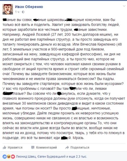 При цьому блогер Іван Оберемко набагато емоційніше висловився з приводу настроїв в суспільстві по відношенню до багатств чиновників.