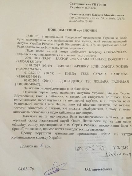"Оскільки справа стосовно народного депутата України Сергія Рибалки, якою я займаюся, стосується не тільки його кримінального переслідування і політичної кар'єри, а й інтересів всієї Радикальної партії Олега Ляшка, маю всі підстави вважати, що ці погрози вбивством є такими, які можуть бути реалізовані. Тому у мене виникають побоювання щодо реального здійснення цих загроз", - написав Олексій Станчевський в своєму зверненні до Нацполіції.