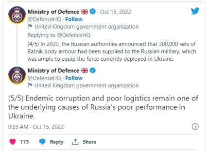 Як вдалося дізнатися британським розвідникам, мобілізовані росіяни погано оснащені через повсюдну корупцію у армії РФ. Ба більше, наголошується, що вони змушені самостійно купувати за завищеними цінами бронежилети, які мали б їм видавати у рамках програми індивідуального екіпірування.